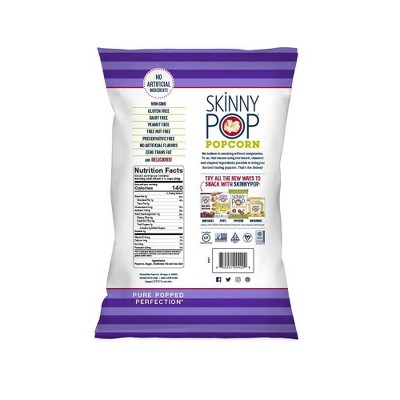 Skinnypop Original Popcorn - 4.4oz : Target •Delicious SkinnyPop Popcorn has zero trans fat •Dairy free, Peanut free, tree nut free, preservative free and is a good source of whole grain and fiber •This 4.4oz grocery-sized bag of SkinnyPop Original Flavor ready-to-eat Popped Popcorn is a great tasting, healthy snack for the whole family Specifications