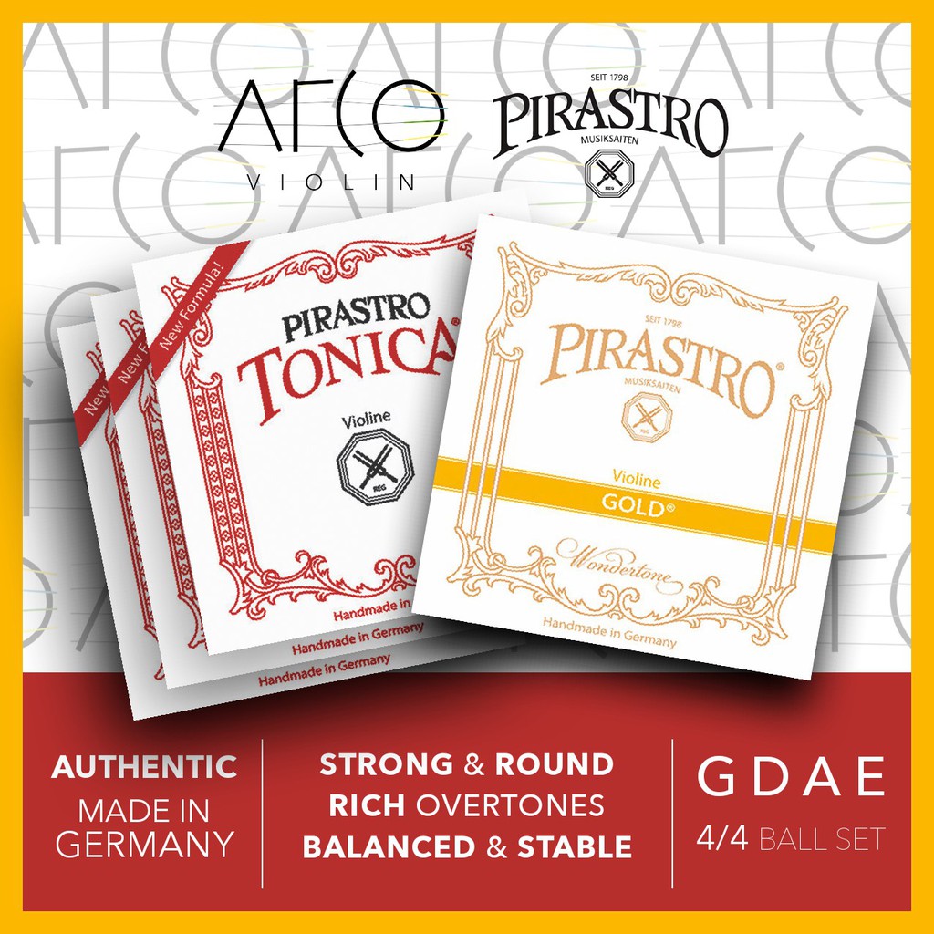 Pirastro Tonica Violin String Set - 4/4 Size Gold Label with Ball-end E ... Pirastro Tonica Violin Strings Features: Violin strings with nylon cores (A, D, and G) E string is culled from the Pirastro Gold Label series. Deliver a lively, well-rounded tone with unparalleled string-to-string balance. Exhibit an open, direct sound regardless of bowing style. Low-hiss performance makes string crossing incredibly smooth.